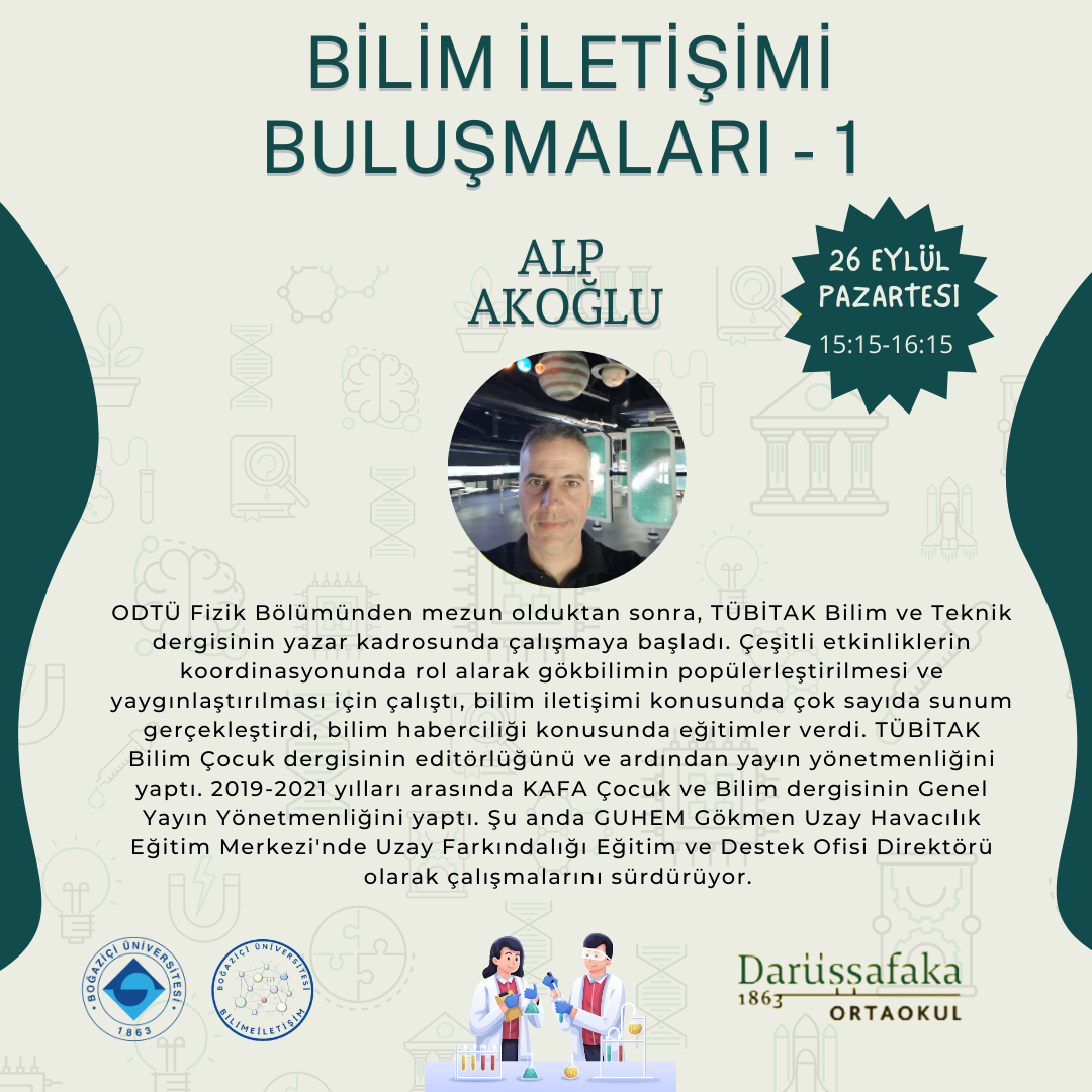 1. Bilim İletişimi Buluşması 26 Eylül Pazartesi 15:15-16:15 arası Darüşşafaka Eğitim Kurumlarında yapıldı. Bu buluşmada Darüşşafaka 7. sınıf öğrencileri Güneş Sistemi ve Ötesi Ünitesi ile ilgili merak ettikleri soruları Boğaziçi Üniversitesi Fizik Bölümü Öğretim Üyesi Dr. Gizem Şengör ve Uzay Farkındalığı Eğitim Destek Ofisi Direktörü Alp Akoğlu’na sordu.