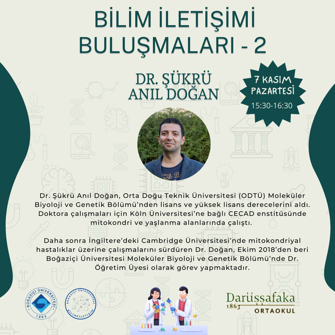 2. Bilim İletişimi Buluşması 7 Kasım Pazartesi 15:30-16:30 arası Darüşşafaka Eğitim Kurumlarında yapıldı. Bu buluşmada Darüşşafaka 7. sınıf öğrencileri Hücre ve Bölünmeler Ünitesi ile ilgili merak ettikleri soruları Boğaziçi Üniversitesi Moleküler Biyoloji ve Genetik Bölümü öğretim üyeleri Prof. Dr. Arzu Çelik ve Dr. Şükrü Anıl Doğan’a sordu.